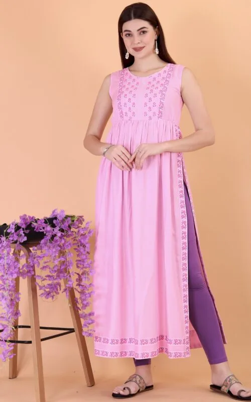 Embroidered Full Length Cotton Women’s Kurti Pink