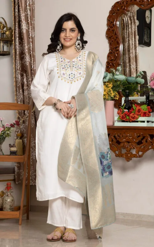 FELLORA Women’s Rayon Cotton Kurti Grey Set with Handwork, KOTA Checks Dupatta, Regular Fit, for Fastive and Party and Office Traditional Indian Ethnic Wear