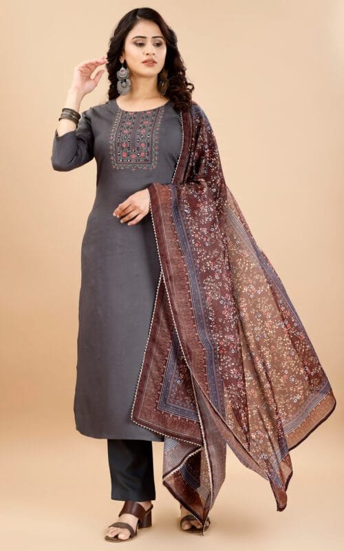 FELLORA Women’s Rayon Cotton Kurti Grey Set with Handwork, KOTA Checks Dupatta, Regular Fit, for Fastive and Party and Office Traditional Indian Ethnic Wear