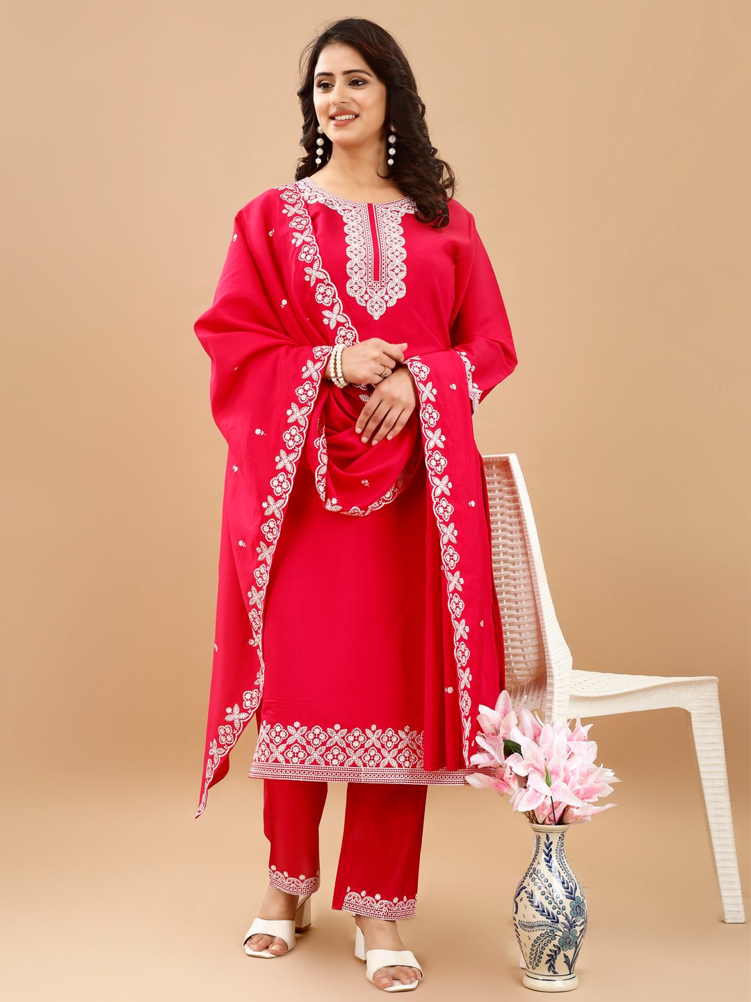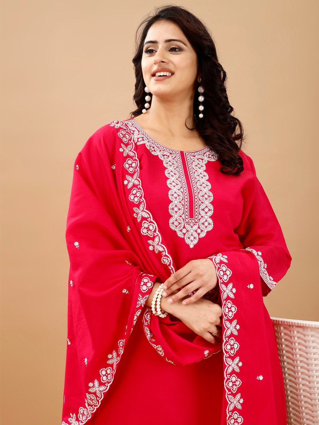 FELLORA-Women’s Red Rayon Cotton Kurta Set with Lucknowi Chickankari and intricate heavy sequence white Embroidery, 3/4 Sleeve Traditional Pant, Suit with Dupatta