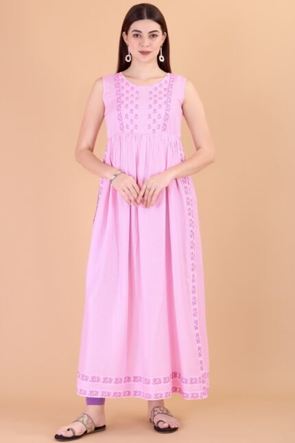 FELLORA Women Chikan Embroidery, Applique Cotton Rayon Flared Kurta-Pink