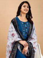 Elevate your ethnic wardrobe with this exquisite three-piece cotton salwar suit set. The ensemble features a pristine white base adorned with delicate blue floral patterns, creating a sophisticated and graceful appearance. The suit is beautifully enhanced with golden border embellishments that add a touch of royal elegance. The matching salwar provides comfort and style, while the coordinated dupatta showcases intricate floral prints and ornate golden borders that perfectly complement the outfit. The traditional V-neckline with detailed embroidery adds a feminine charm. Perfect for festivities, weddings, and special occasions, this ensemble combines comfort with classical Indian aesthetics. The cotton fabric ensures breathability and ease of movement, making it suitable for extended wear. The white and blue colour combination offers versatility in styling, while the golden accents create a festive appeal. This ethnic wear masterpiece exemplifies traditional craftsmanship while maintaining contemporary appeal.